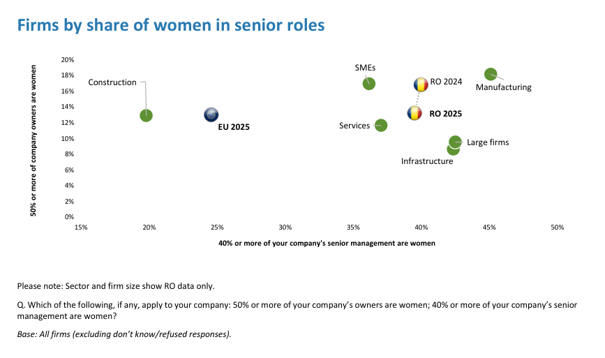 România se distinge pozitiv în ceea ce privește echilibrul de gen în funcțiile de conducere, 40% dintre firme declarând că femeile reprezintă cel puțin 40% din personalul de conducere de nivel superior, fiind mult peste nivelul UE de 25%.