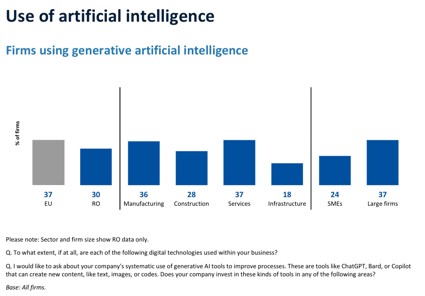 Proporția companiilor care utilizează multiple tehnologii digitale avansate a urcat la 48%, fiind comparabilă cu nivelul UE, cu 34% dintre IMM-uri care folosesc mai multe tehnologii. 24% din firmele mici și mijlocii folosesc inteligența artificială generativă, pe când aceasta este folosită de 37% din marile companii participante la studiu. Utilizatori români ai IA sunt îndeosebi activi în marketing și vânzări, domenii în care se află înaintea mediei UE.