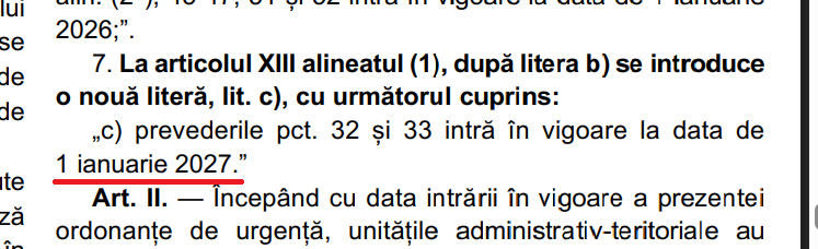 Ordonanța de urgență 78/2025, publicată de Guvern, miercuri seara, în Monitorul Oficial, dispune ca prevederile Legii 239/2025 (Pachetul 2 fiscal), privind creșterea impozitului local pe imobiliarele firmelor, să intre în vigoare de la 1 ianuarie 2027.
