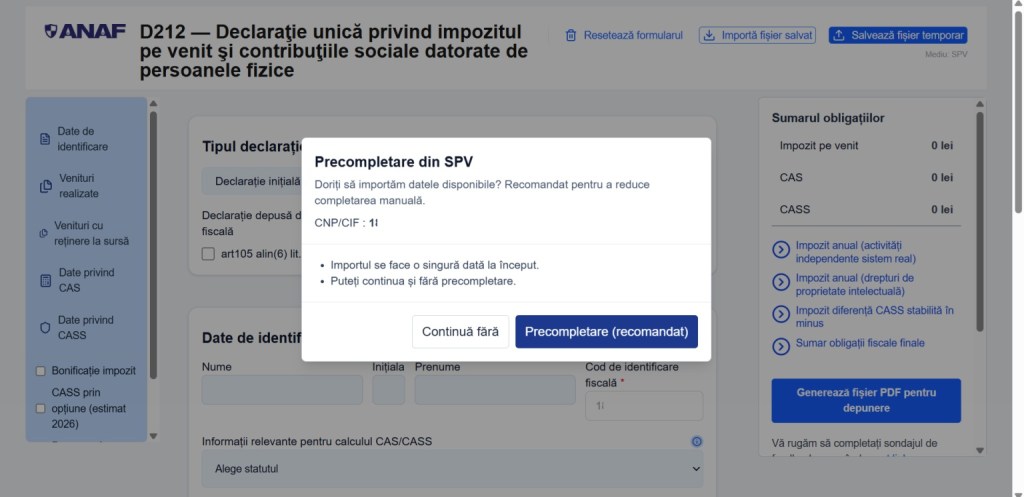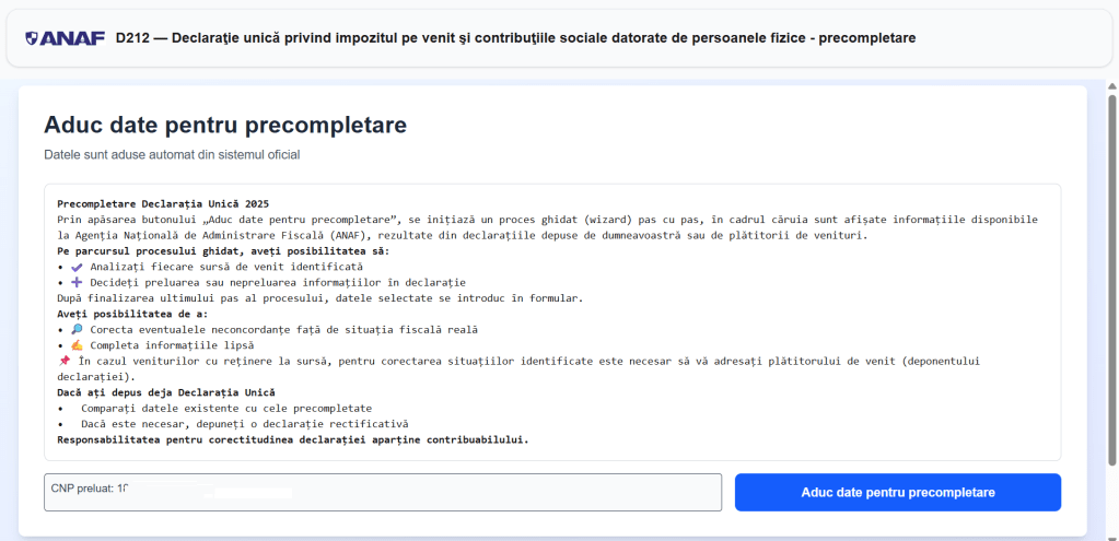 „La Sectiunea Depunerii declaratie unica si alte formulare - pe site ANAF după autentificare va apărea - Declarația unică 2026. Se pot importa datele precompletate in Declaratia unica dar inainte sa o depuneti sa verificati corectitudinea datelor aduse în formular. Pentru venituri din activitati independente am văzut ca se preiau doar datele contribuabilului , nr autorizatie , data eliberării acesteia. Se preia venitul brut pe 2024 si venit net pe 2024. Normal, pentru ca alte informații pe 2025 nu are de unde sa le ia. Dar pentru veniturile cu stopaj la sursa declarate de platitorul de venituri (drepturi de autor , dividende , chiirii , dobanzi ) e folositoare fiind preluate din Declarațiile 112 , 205 sau din C168”, a explicat Grama.