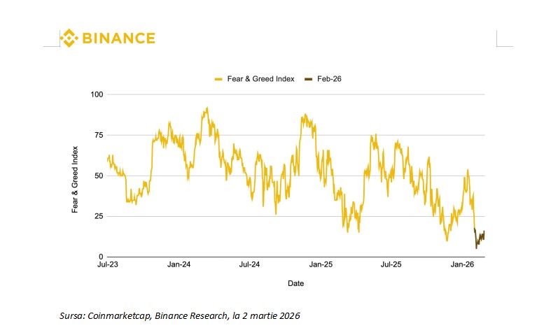 La începutul lunii martie, sentimentul investitorilor rămâne scăzut. Indicele „Fear & Greed” pentru criptomonede a rămas în zona „Extreme Fear” pe parcursul întregii luni februarie.