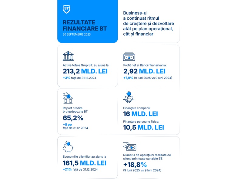 - Economiile clienţilor BT au ajuns la 161,5 miliarde lei, +7,1% față de 31 decembrie 2024, respectiv +13,1% comparativ cu septembrie 2024.