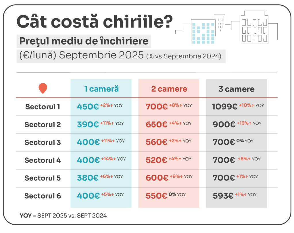 La nivelul Bucureștiului în ansamblu, chiria medie a unei garsoniere a ajuns în septembrie la 403 euro, în creștere cu 9% față de 2024, în timp ce pentru apartamentele cu două camere media a fost de 602 euro, cu 4% mai mult decât în aceeași lună a anului trecut. Pentru apartamentele cu trei camere, chiria medie a urcat la 831 de euro, cu 5% peste nivelul din septembrie 2024.
