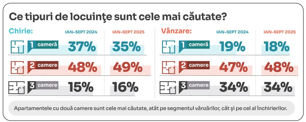 Potrivit aplicației Storia, platforma de imobiliare a OLX, în București, cele mai căutate apartamente pentru închiriere și vânzare, în perioada ianuarie-septembrie 2025, au fost apartamentele cu două camere. Pe segmentul vânzărilor, pe primul loc în topul căutărilor se află apartamentele cu două camere (48%), urmate de apartamentele cu trei camere (34%) și abia apoi de garsoniere (18%). În schimb, pe segmentul închirierilor, apartamentele cu două camere (49%) s-au aflat în topul căutărilor și au fost urmate de garsoniere (35%) și de apartamentele cu trei camere (16%).