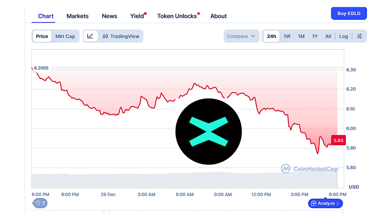Criptomoneda românilor de la MultiversX, EGLD (fostul Elrond) a picat, luni, 29 decembrie 2025, sub prețul de 6 dolari pe unitate, după o relativă perioadă de acalmie pe piața crypto, de Crăciun. Liderii, Bitcoin și Ethereum, au suferit și ei scăderi de valoare.