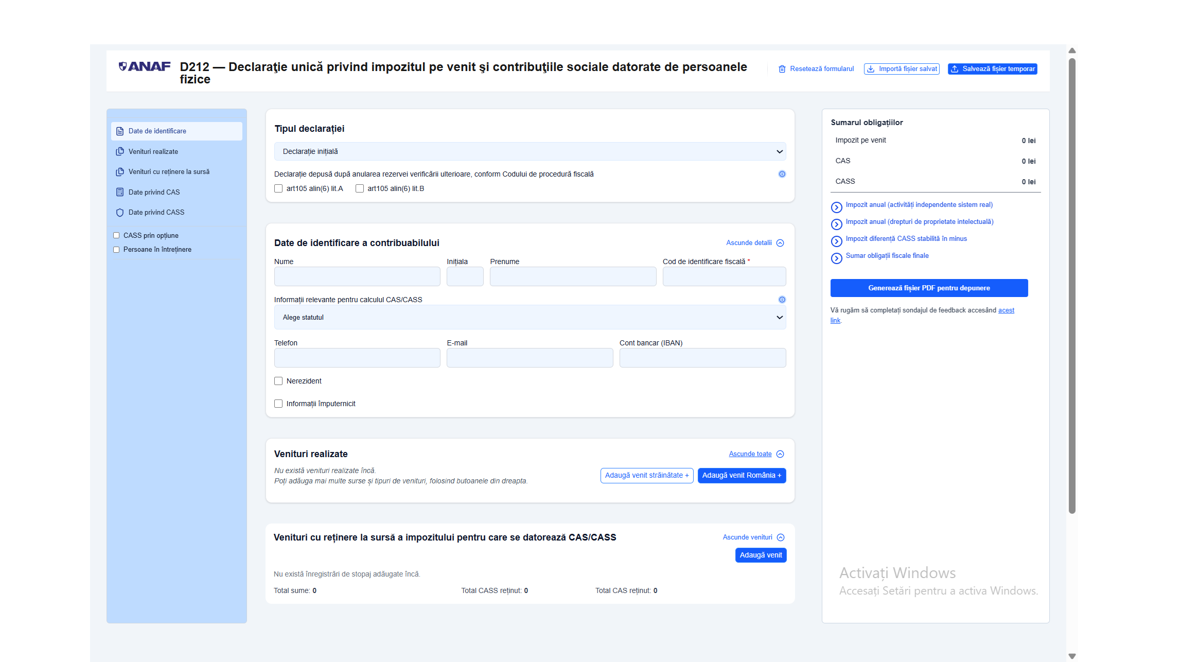 Dacă în anii trecuți, pentru completarea Declarației Unice ANAF publica un PDF în format editabil („inteligent”), în 2026 Fiscul a venit cu acest sistem de generare a formularului.