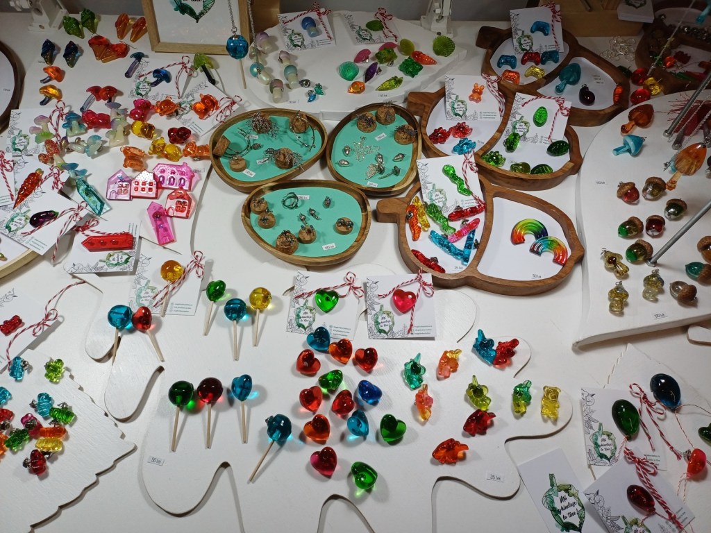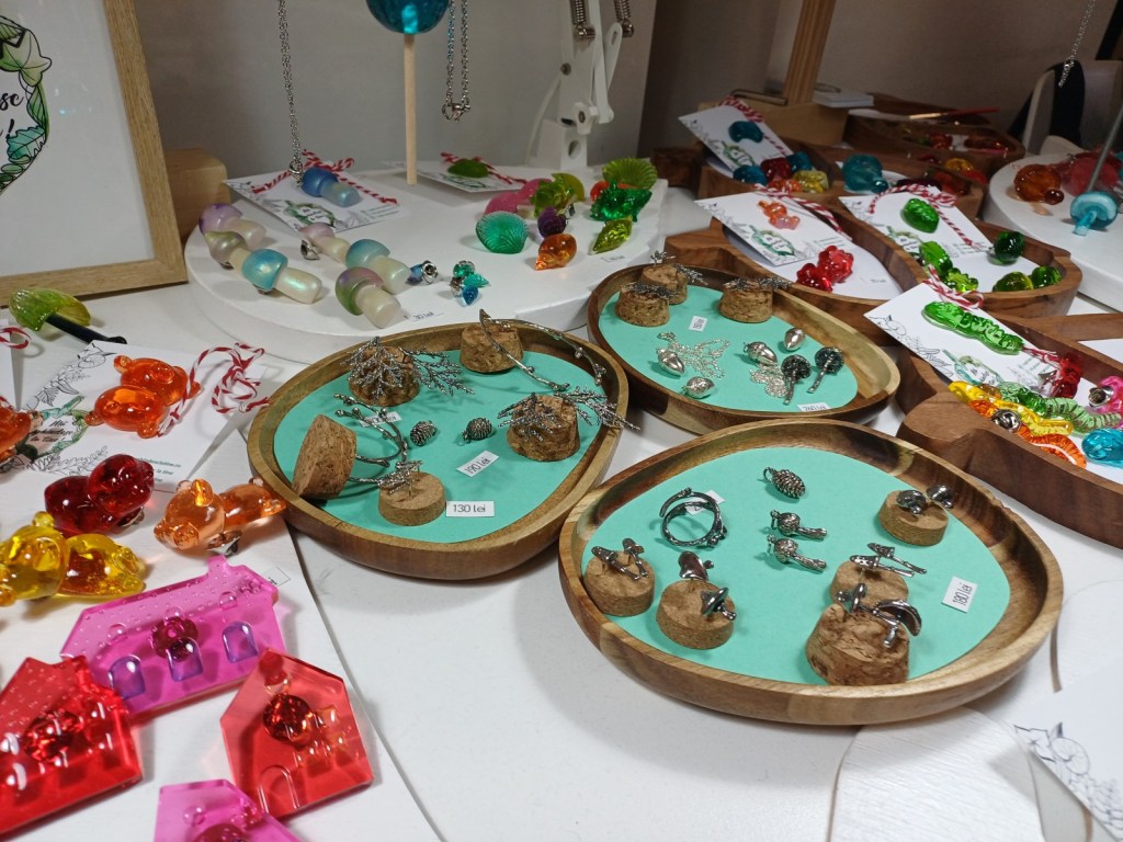 El s-a pregătit pentru Mărțișor cu diferite modele de broșe și pandantive, de la ursuleți de jeleu, ciuperci și căsuțe la dinozauri, acadele, inimi și curcubee. Prețurile variau între 30 lei și până la peste 100 lei pentru produsele din rășină, iar lucrările din argint, inox sau aluminiu aveau prețuri de la 130 lei până la aproape 300. Afacerea lui Andrei există din anul 2012, dar a primit un rebranding în anul 2018, iar pentru realizarea anumitor modele, lucrează chiar și câteva zile pline, mi-a spus el la târg.