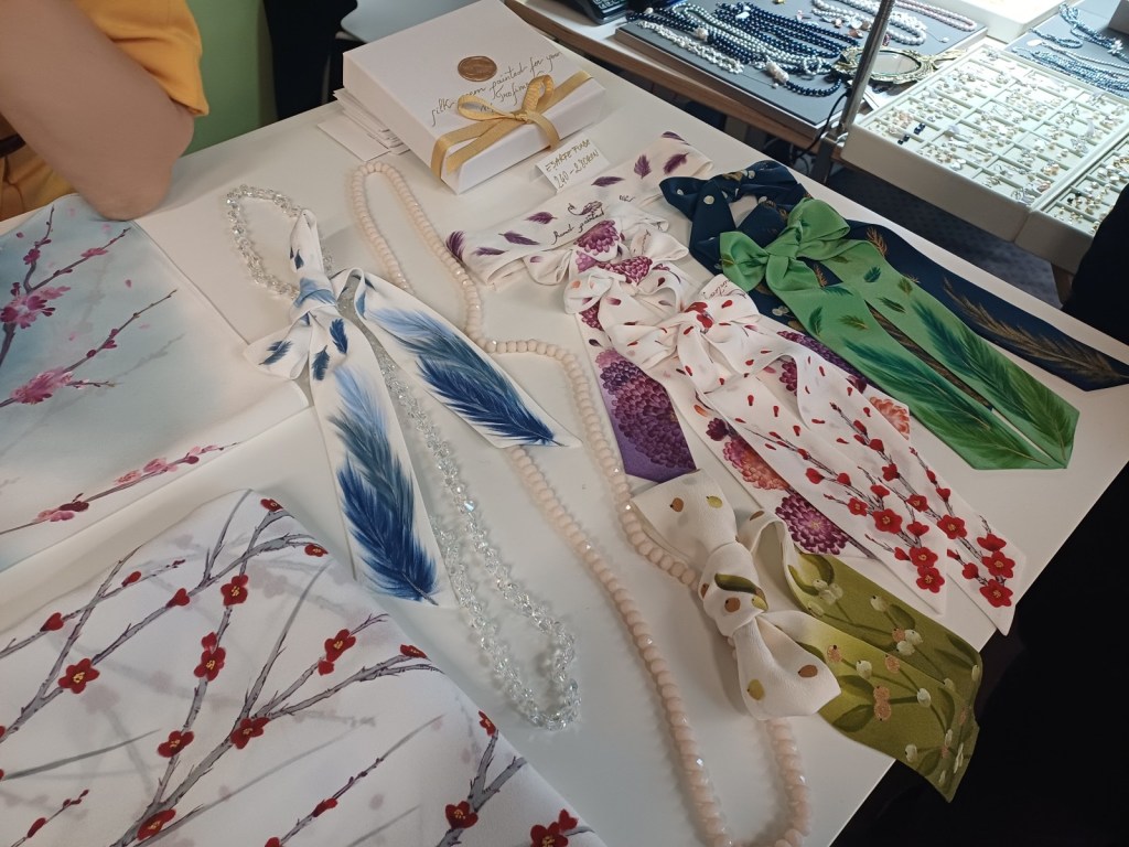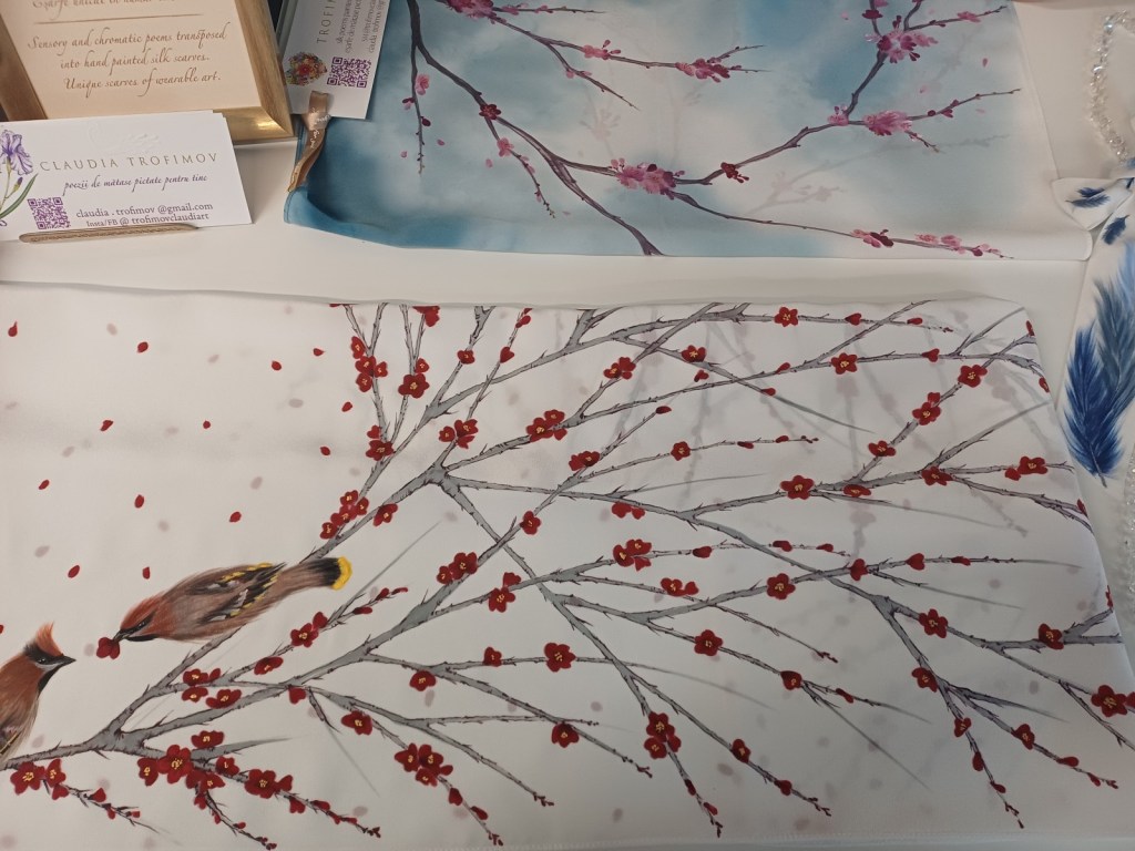 La târg, am vorbit și cu Claudia Trofimov, pictoriță de mătase, care și-a adus eșarfele și fundele pictate manual la vânzare. Acestea sunt unicat, spune ea, iar pentru a le face, de la design până la produsul final, spune că stă între 3-4 ore și 8 ore, și chiar 2 zile pentru modelele mai complexe.