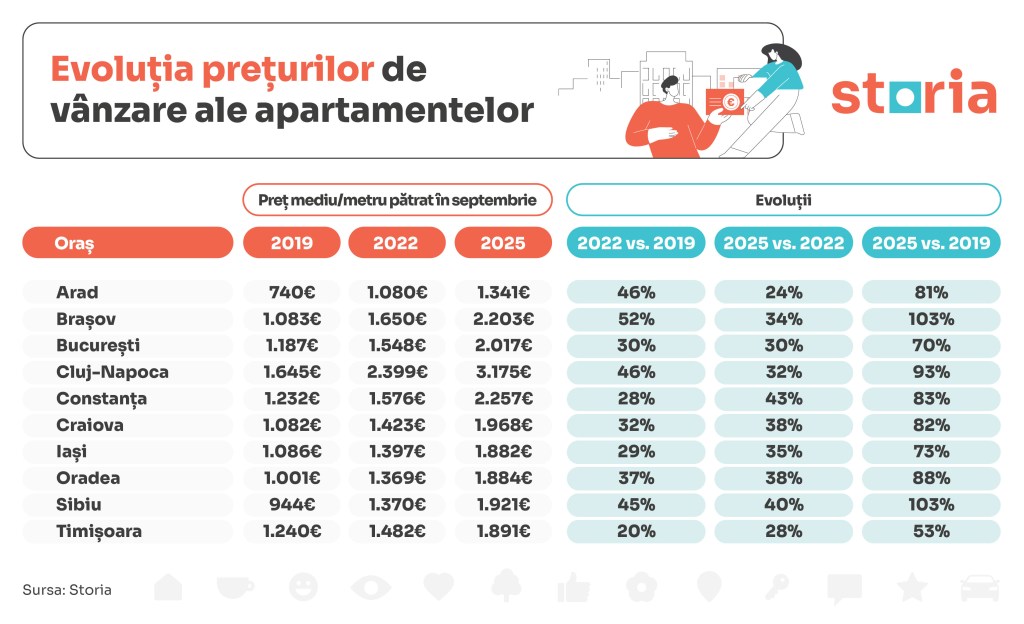 Raportat la numărul de anunțuri publicate pe platforma Storia în fiecare dintre cele 10 orașe analizate, prețul mediu ponderat al apartamentelor din România a crescut cu 34% între septembrie 2019 și septembrie 2022, de la 1.232 de euro la 1.648 de euro pe metru pătrat. Ulterior, prețul mediu ponderat a crescut cu 29% între septembrie 2022 și septembrie 2025, până la 2.131 de euro pe metru pătrat. Cumulat, între septembrie 2019 și septembrie 2025, prețul mediu ponderat al apartamentelor din cele 10 orașe analizate a crescut cu 73%.