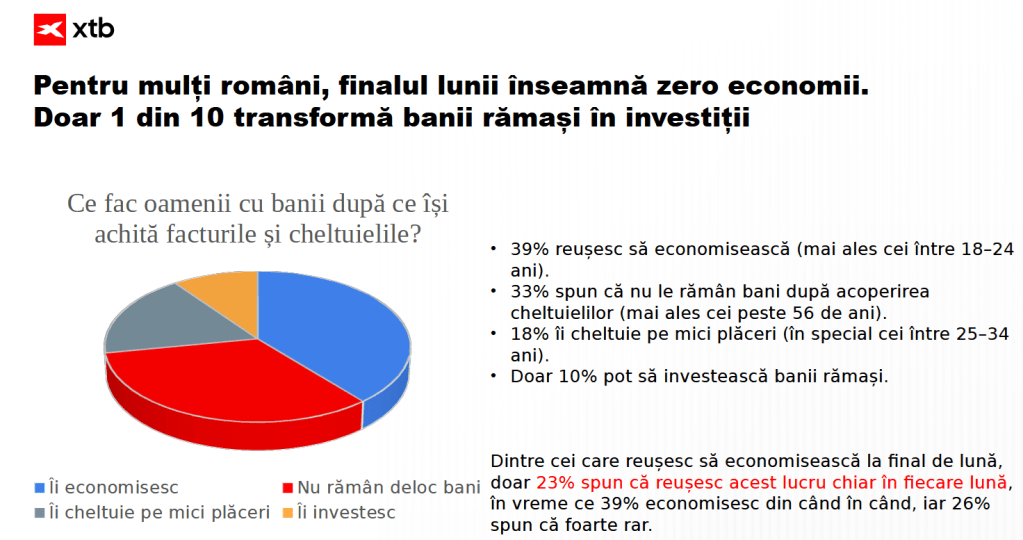 „Aceste rezultate nu sunt doar statistici, ci și un semnal de alarmă, pentru că arată câtă nevoie au românii de stabilitate financiară și de încredere în propriile decizii legate de bani. Este semnalul că trebuie începută o discuție serioasă despre cum putem transforma banii dintr-o resursă de supraviețuire într-un instrument pentru siguranță. Banii nu trebuie doar câștigați și cheltuiți, ci și puși la treabă pentru a construi viitorul”, comentează Irina Cristescu, general manager XTB România.