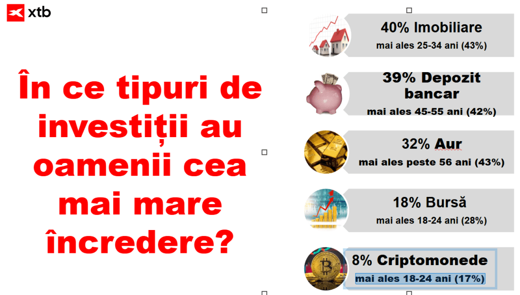 În ce privește preferința pentru investiții sau pentru economii, oamenii au declarat că preferă opțiunile pe care ei le percep ca fiind sigure sau tangibile. Concret, imobiliarele (40%) și depozitele bancare (39%) domină topul. Lista continuă cu aurul (32%), cu investițiile la bursă (18%) și cu investițiile în criptomonede (8%).