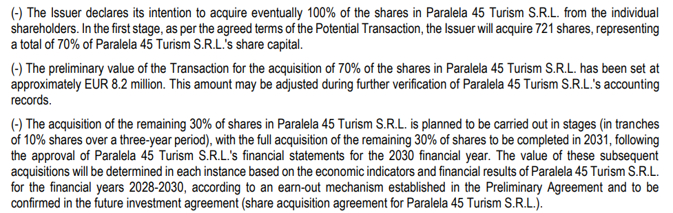 „Valoarea acestor achiziții ulterioare va fi determinată, în fiecare caz, pe baza indicatorilor economici și a rezultatelor financiare ale Paralela 45 Turism S.R.L. pentru exercițiile financiare 2028–2030, conform unui mecanism de tip earn-out stabilit în Acordul Preliminar și care urmează a fi confirmat în viitorul acord de investiții (contract de achiziție de părți sociale pentru Paralela 45 Turism S.R.L.)”, se mai arată în raportul financiar al Rainbow Tours.