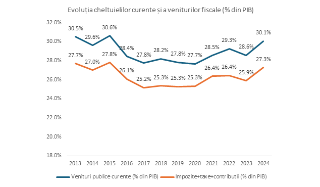 Ponderea veniturilor din taxe, impozite și contribuții a ajuns la aproximativ 27,3% din PIB la finalul anului 2024, apropiindu-ne de nivelele din 2013-2015.
