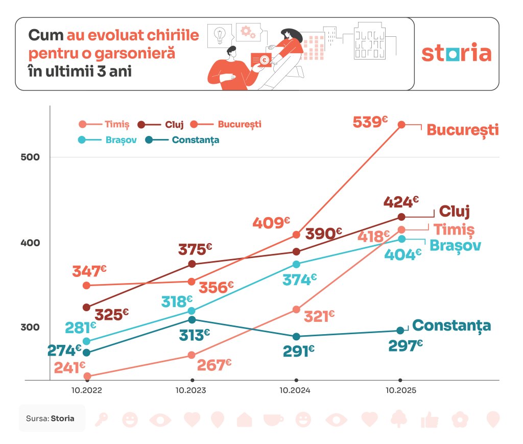 Platforma a calculat gradul de accesibilitate al pieței imobiliare folosind prețul mediu cerut pe Storia pentru chirii de garsoniere, apartamente cu două camere și apartamente cu trei camere în luna octombrie din anii 2022, 2023, 2024 și 2025.