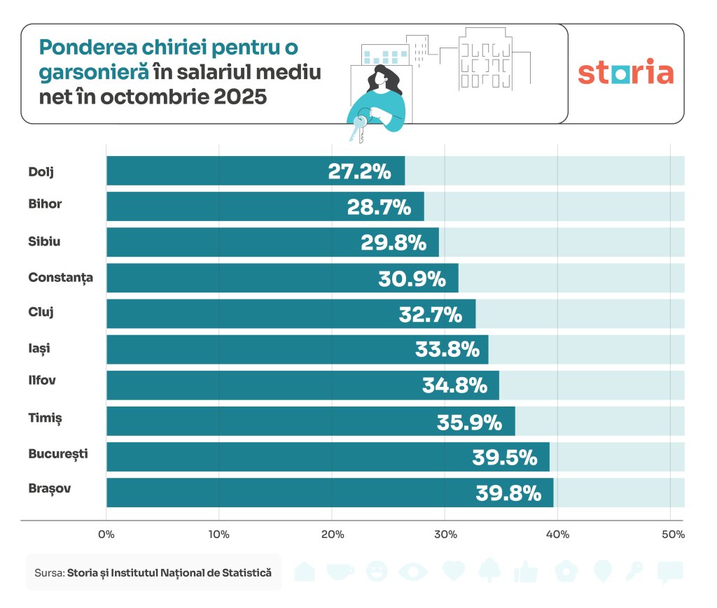Astfel, în 2022, bucureștenii plăteau 33% din salariul mediu net pentru chiria unei garsoniere, însă procentul a crescut la aproape 40% într-un interval de 3 ani. Între timp, în Brașov, ponderea chiriei în salariul mediu net a crescut de la 36% în 2022 la 40% în prezent. Singurul alt județ important în care ponderea chiriei în venituri a crescut în ultimii 3 ani este Timiș, de la 28% la 36%.