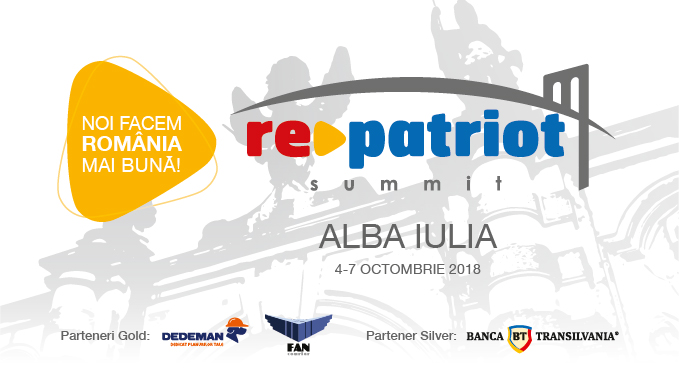 Împrăștiați în cele patru zări ca să-și caute succesul, românii revin acum acasă, la Alba Iulia, în capitala de suflet a neamului românesc. Cei care au reușit în afaceri în Occident și antreprenori din România sunt chemați să se înscrie la Summitul RePatriot desfășurat între 4-7 octombrie 2018 sub deviza „Noi facem România mai bună!”