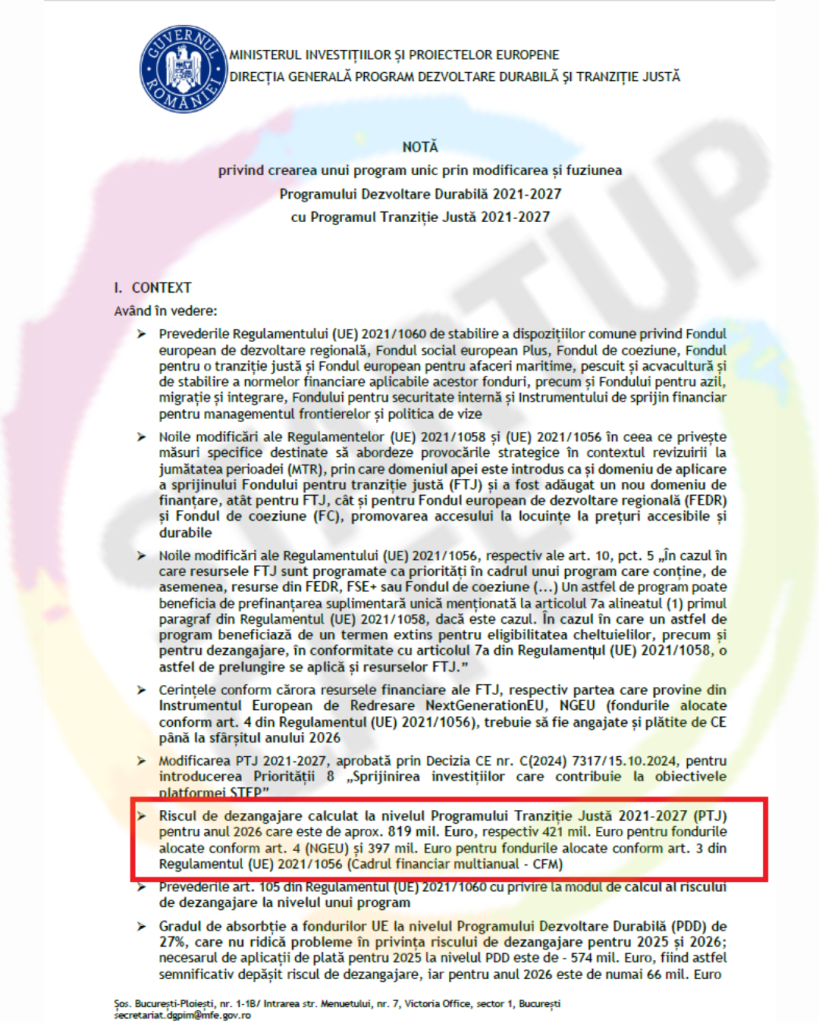 „Riscul de dezangajare calculat la nivelul Programului Tranziție Justă 2021-2027 (PTJ) pentru anul 2026 care este de aprox. 819 mil. Euro, respectiv 421 mil. Euro pentru fondurile alocate conform art. 4 (NGEU) și 397 mil. Euro pentru fondurile alocate conform art. 3 din Regulamentul (UE) 2021/1056 (Cadrul financiar multianual - CFM)” - se arată într-o notă internă a MIPE.