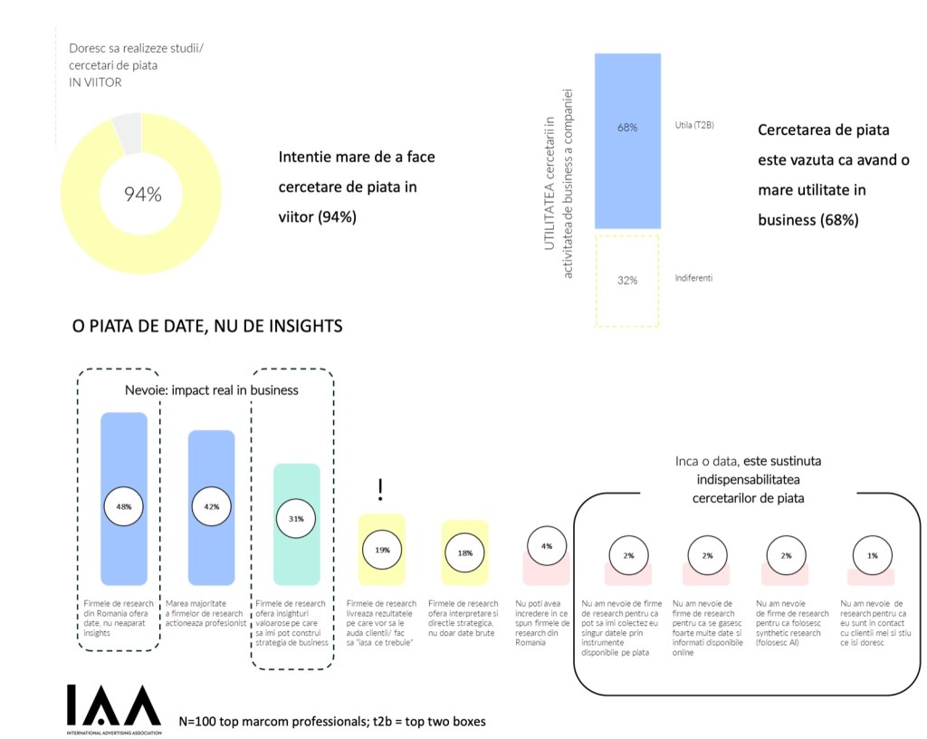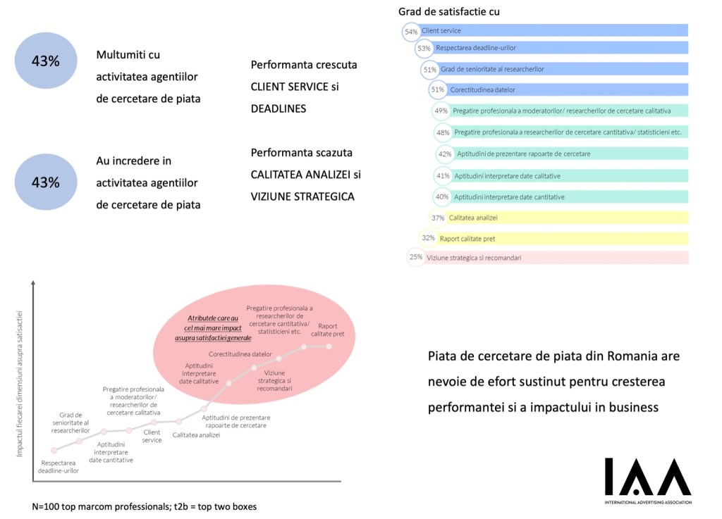 Unul dintre cele mai relevante semnale din raport este acela că 48% dintre respondenți consideră că firmele de research din România oferă mai degrabă date, nu insight-uri, ceea ce subliniază ruptura dintre cercetare și decizie strategică. În plus, gradul de satisfacție privind partea de analiză strategică și recomandări este de doar 25%, în timp ce zona de „igienă”, precum client service-ul, atinge 54%, ceea ce indică o piață orientată spre proces, nu spre valoare adăugată.